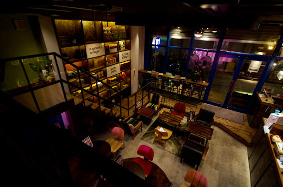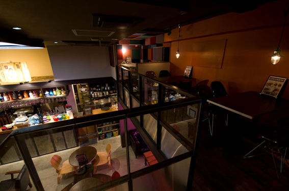コンセプトは ”外国の港町の倉庫を改造して作ったカフェ”。 天井の高さを生かし造作したロフト、デッキのようなエントランス、無骨な鉄の手すり、分厚い棚板、スケルトンのままのコンクリート床・・などが倉庫の要素。そこにモダンな照明やカラフルなアイテムを配置し、1軒のカフェに落とし込みました。